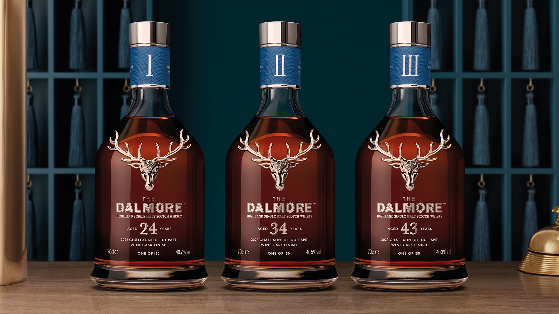 Designed by Burgess Studio, each bottle features a solid silver stopper and collar, inlaid with foiled Saffiano leather. The trio is presented in round “hat box” cases, crafted by Italian luggage makers in ‘French Blue’ Saffiano leather, complete with a matching handle and luggage tag containing details of the whisky. The case functions both as a carry case and a display plinth. An accompanying book chronicles the shared history of Château Mont-Redon and The Dalmore, while miniature tasting kits — comprising three 5cl bottles — allow collectors to explore the series in depth.