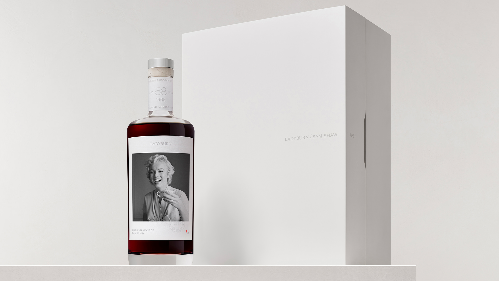 Ladyburn One of One 2025 – This is the oldest whisky ever released from the now lost Ladyburn Distillery, distilled in 1966 and bottled in 2025 at 58 years old. Only operational for nine years from 1966 to 1975, and with very few official bottles released in its history, Ladyburn is, for many, the ultimate ‘ghost’ whisky (ghost is the colloquial term given to a whisky from a distillery that no longer exists). Entirely dismantled in 1976, not only has the distillery itself vanished, but Ladyburn had no visual identity whatsoever; no logos, bottles, or packaging. All that remains of it is the whisky. And that is how we have left it. Almost invisible. A ghost. But also a platform to show all the excitement and dynamism of the period when the whisky was made; a time of optimism and great change. For the Distillers One of One Auction, Ladyburn has partnered with the estate of photographer Sam Shaw to share a rarely seen and intimate portrait of his great friend, Marilyn Monroe.